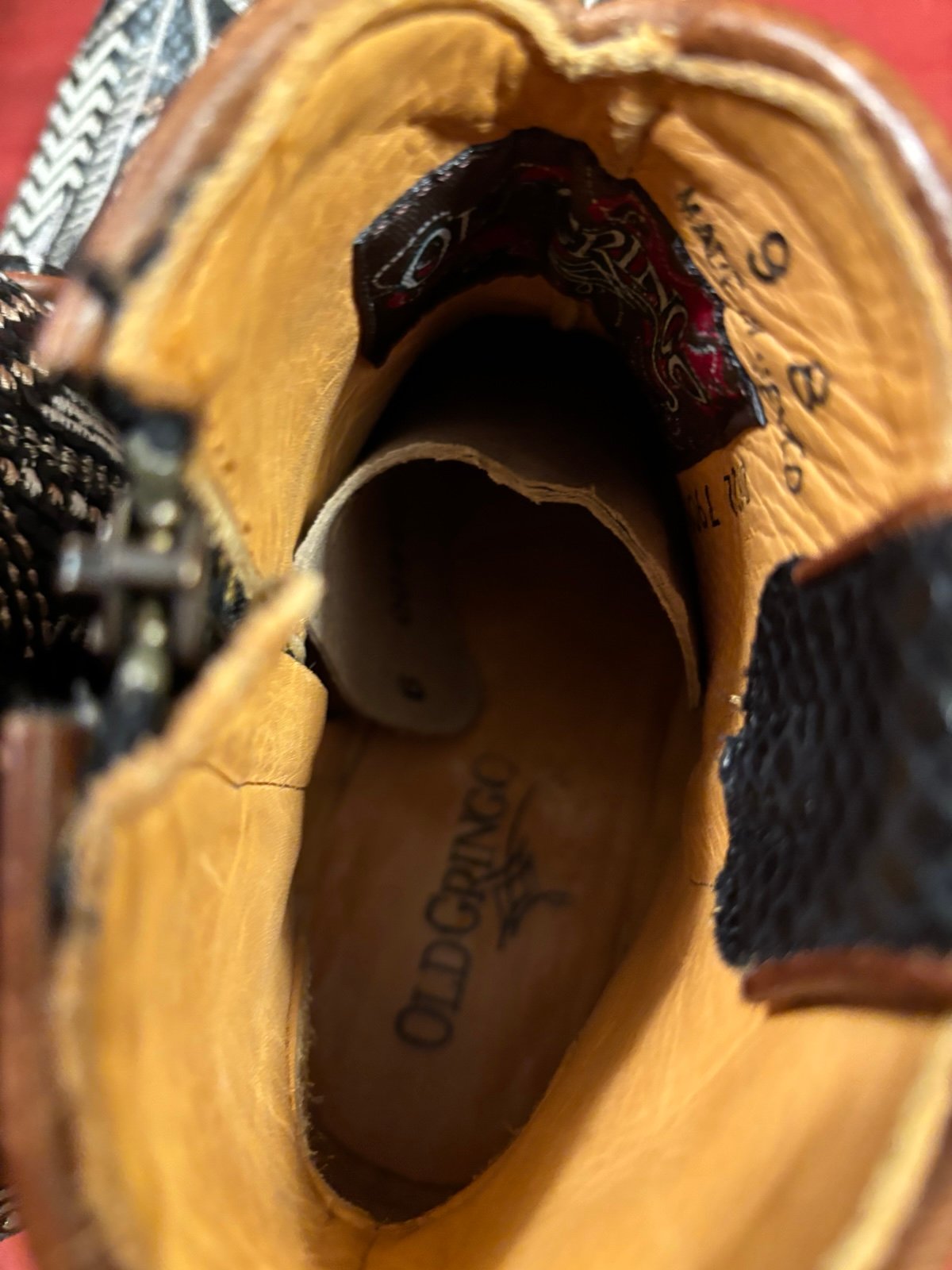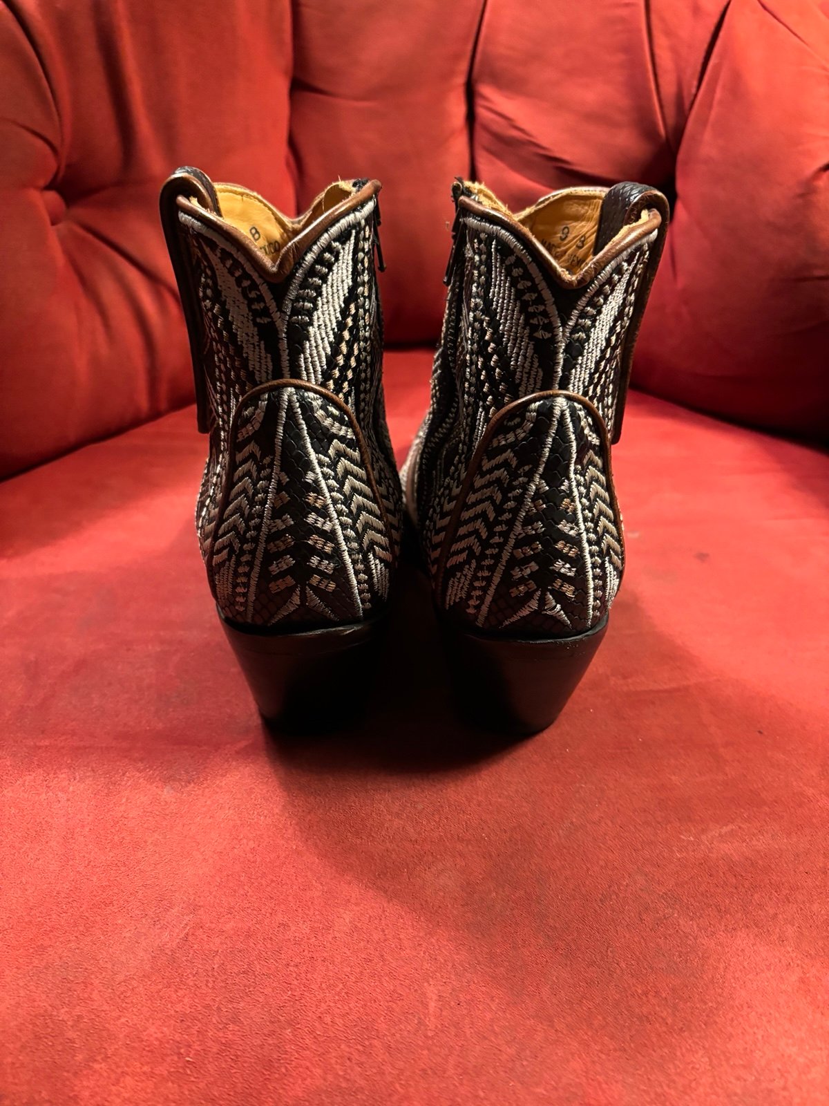 Absolutely stunning, beautifully detailed old gringo boots. Gorgeous color combination of black, white and red stitching. 7 inch shaft offers a fun look with dresses or jeans. These boots have been worn twice so they still need to be broken in. High-quality leather. Size 9, that fit true to size.